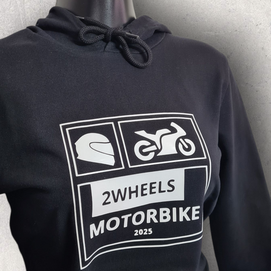 Sweat à capuche noir femme " 2wheels motorbike 2025 " pour motarde