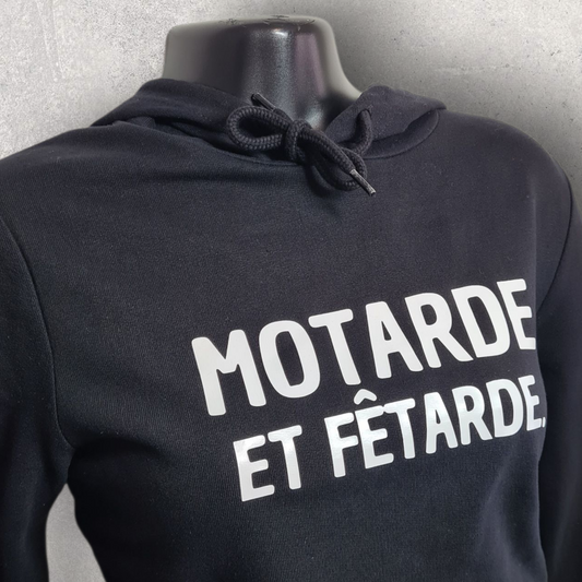 Sweat à capuche noir femme " Motarde et fêtarde "