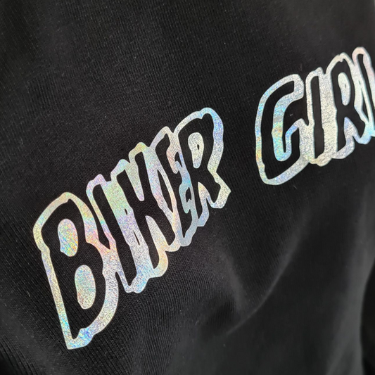 Sweat noir à capuche femme " Bikergirl " holographique
