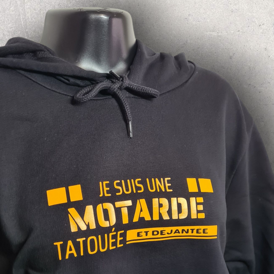 T-shirt à capuche noir femme " Je suis une motarde tatouée et déjantée "
