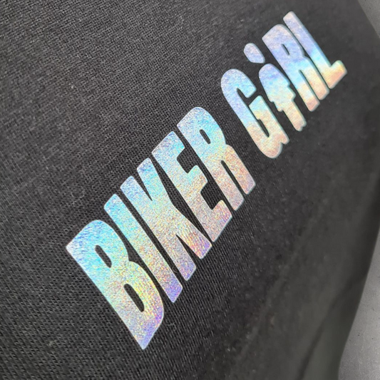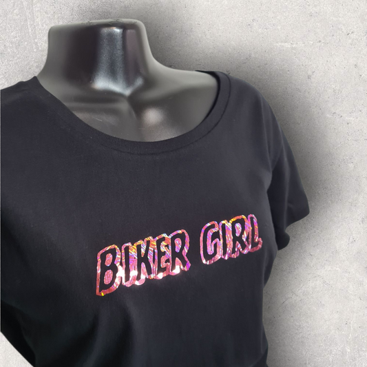 T-shirt noir à manche courte femme " Biker girl " holographique