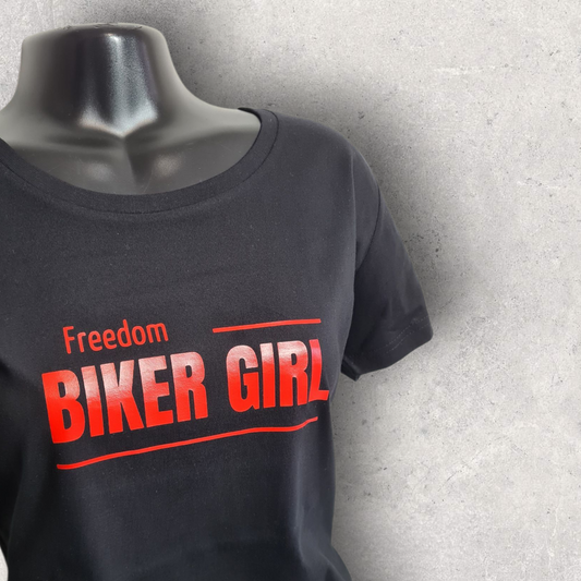 T-shirt noir à manche courte femme " Freedom biker girl " pour motarde