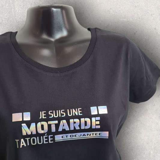 T-shirt noir à manche courte femme " Je suis une motarde tatouée et déjantée " holographique