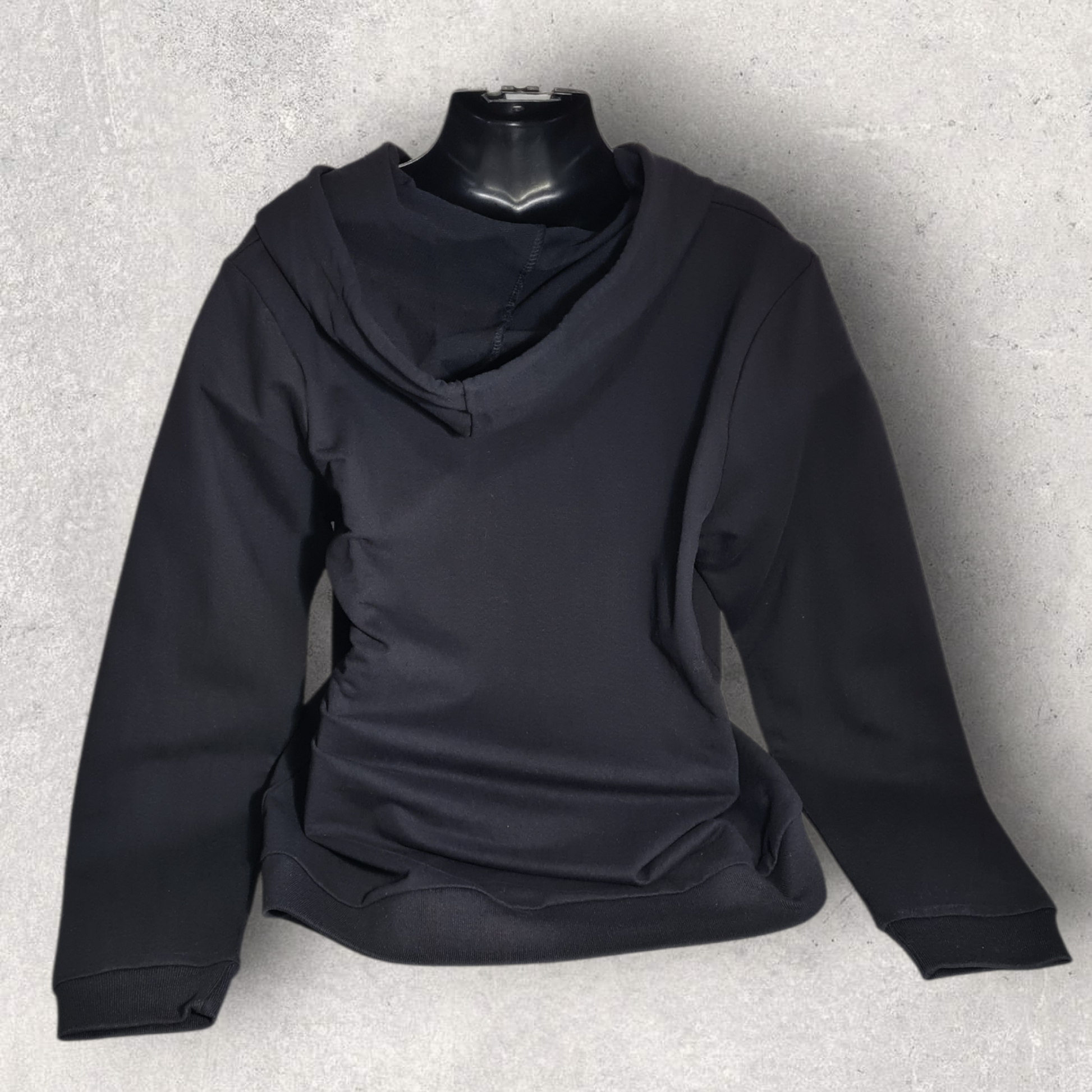 Sweat noir à capuche pour femme, 80 % coton, 20 % polyester pour une coupe agréable et une bonne tenue au quotidien.