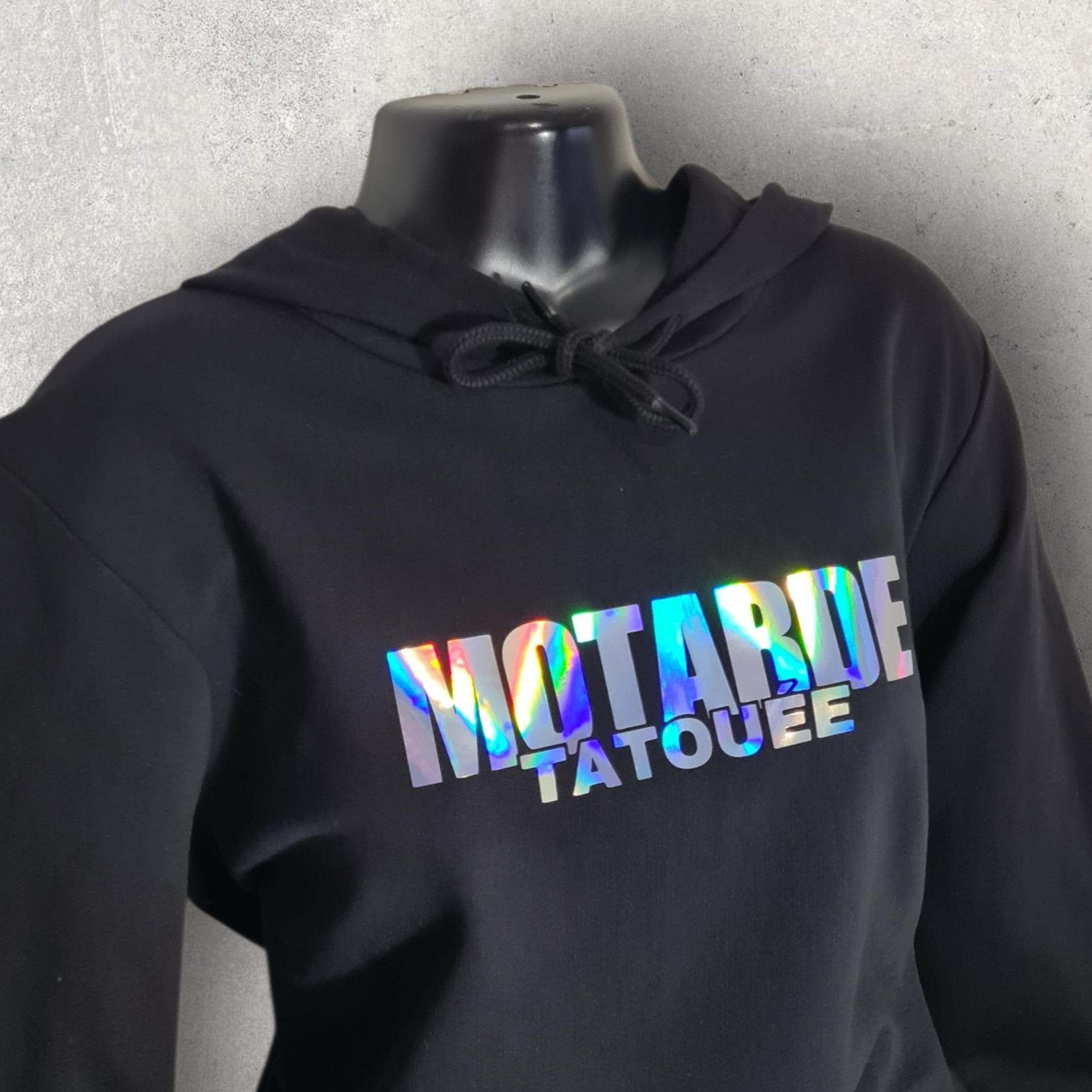 Sweat à capuche noir femme " Motarde tatouée " holographique