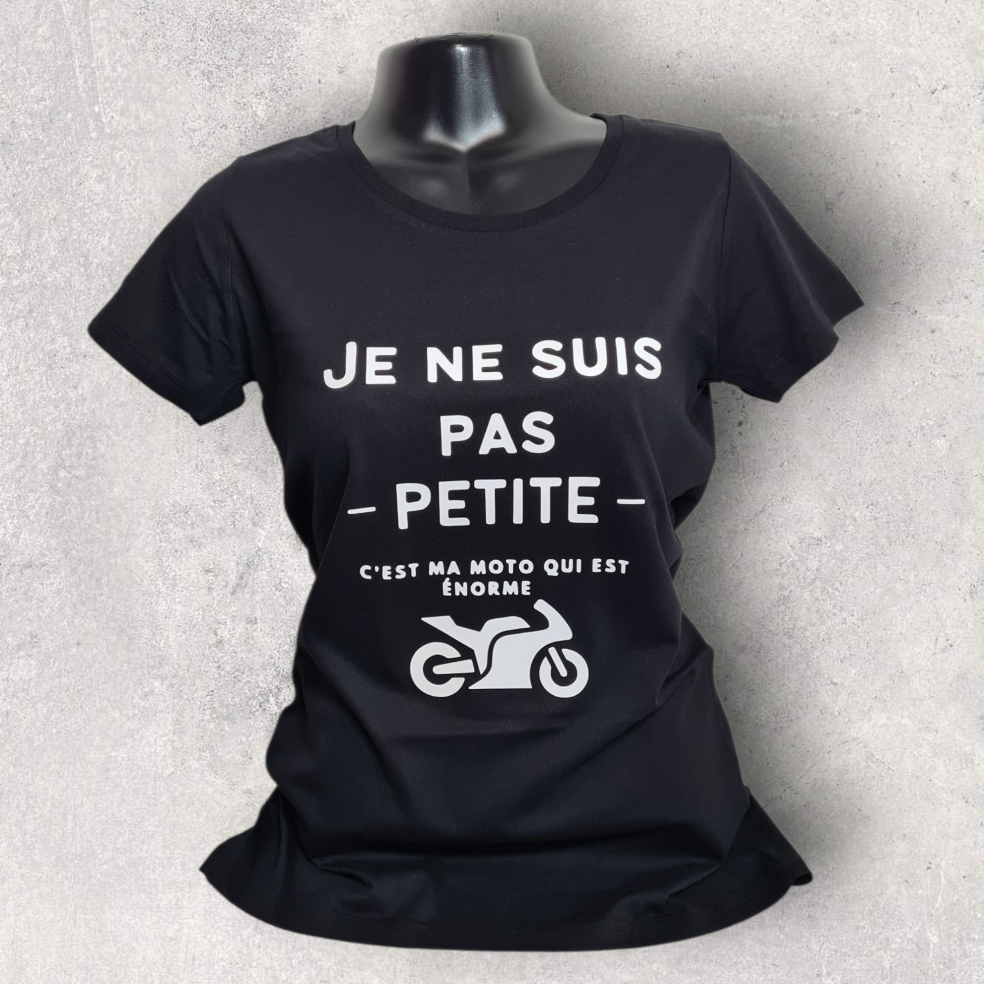 T-shirt noir à manche courte " Je ne suis pas petite c'est ma moto qui est énorme " pour motarde